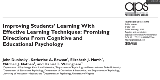 The 15 minute forum tonight was led by yours truly. As Y11 begin the final countdown from mock exams to the their final exams in the summer, Andy Tharby and I have been reviewing the resources and guidance that we give them, to support their revision. Over the years this has accumulated into a large booklet full of revision ‘advice’. The problem is that this booklet has become far too big and contains too many techniques and so ends up adding to their confusion! Furthermore, many of the techniques are questionable. So, we looked to the paper above (download here) to gain some clarity.